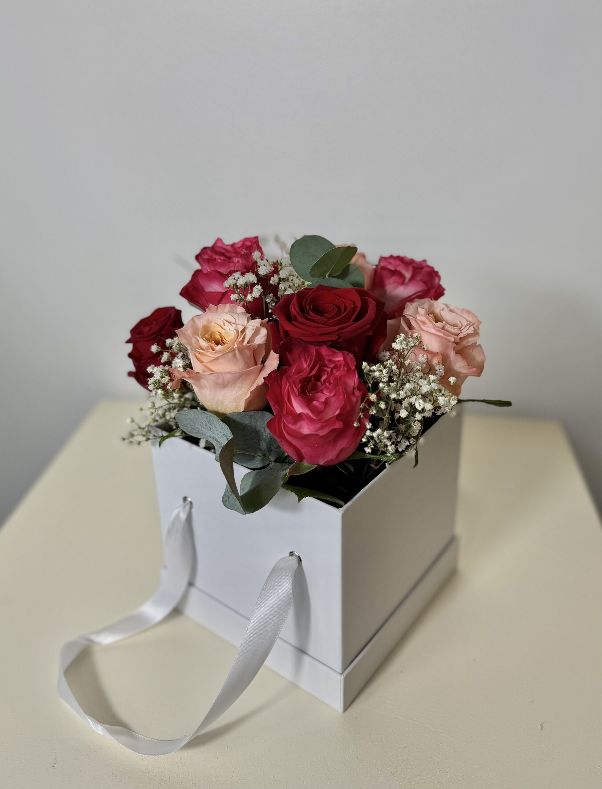 gefüllt mit Rosen in apricot-pink-rot Tönen